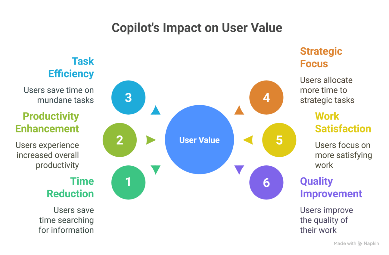 Productivity Boost: Over 70% of users reported M365 Copilot reduced time spent searching for information and performing routine tasks. For many, this meant more time for strategic activities. "Improves productivity" was a top benefit across nearly all professions.