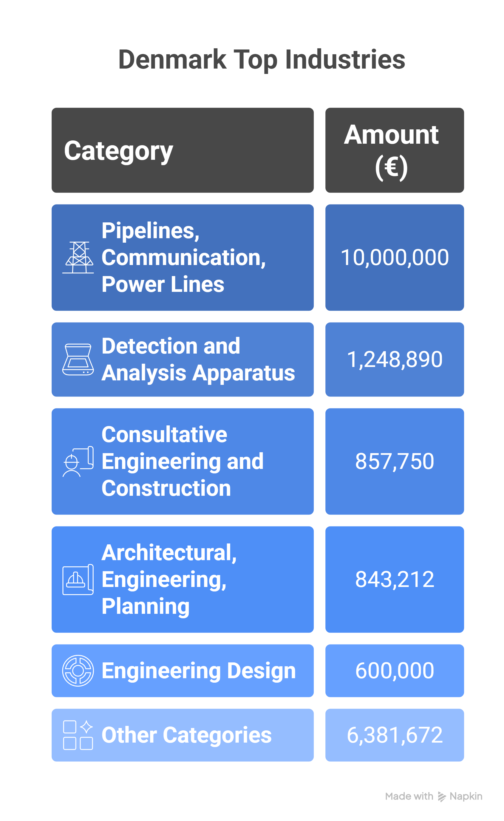 ⚡ Energy drives high-value contracts: Energinet Eltransmission A/S and Gas Storage Denmark A/S awarded contracts worth over €18M, underscoring Denmark’s focus on energy security and its green transition.