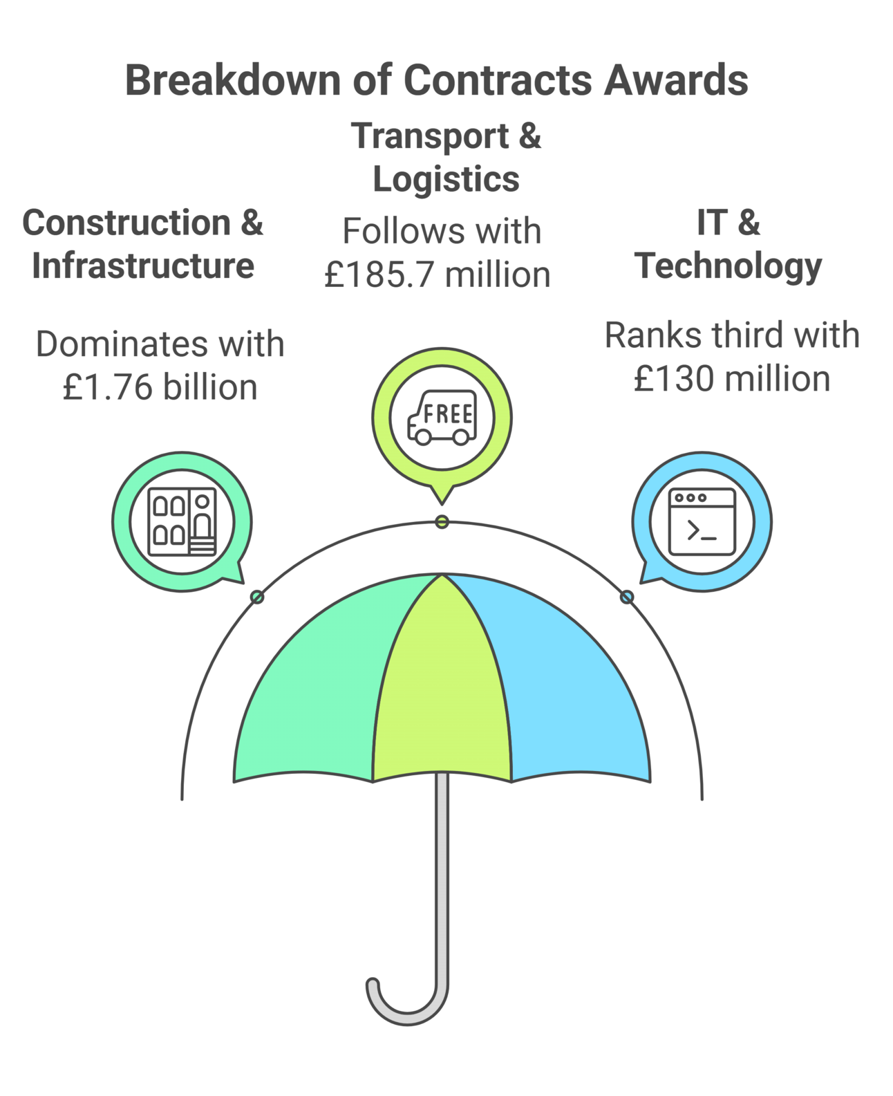 £2.14 billion in public contracts shows infrastructure dominates (82.4%), followed by transport (8.7%) and technology (6.1%). The government's focus on physical infrastructure continues alongside digital transformation initiatives.