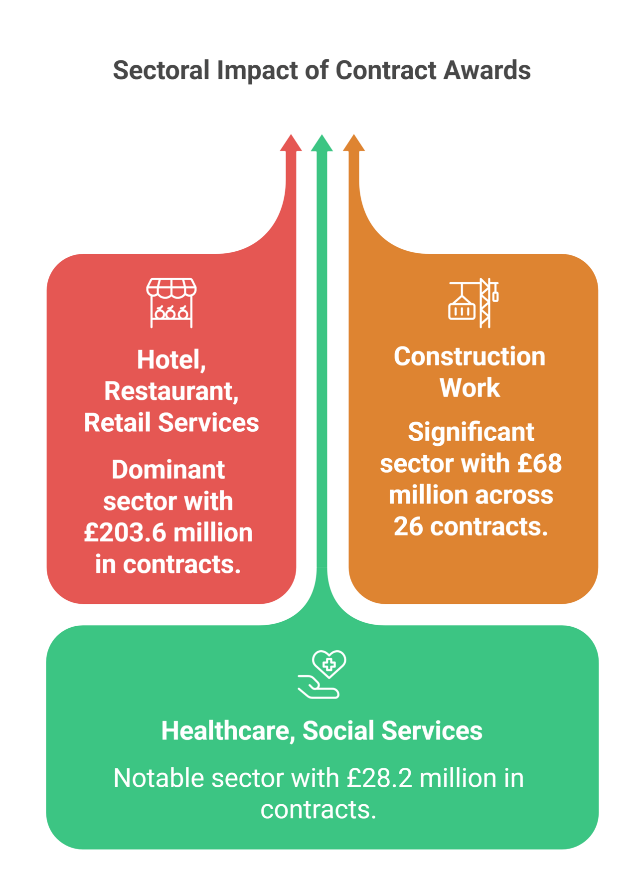 March 5th awards show significant concentration in hospitality/retail services (51%) and construction (17%), creating great opportunities for specialized suppliers in these domains. The Ministry of Defence dominates spending, while Yorkshire receives the highest regional investment. Despite only 2 contracts, hotel/retail services captured £203M in value, while 26 construction contracts totaled £68M. This stark contrast in value-per-contract ratios (£101.8M vs £2.6M) highlights the strategic importance of targeting high-value sectors rather than high-volume opportunities. Yorkshire's overwhelming dominance in today's awards (£238M) alongside major local authority investments suggests potential for broader regional growth and supply chain opportunities. Companies should strategically position for the next wave of related procurements.