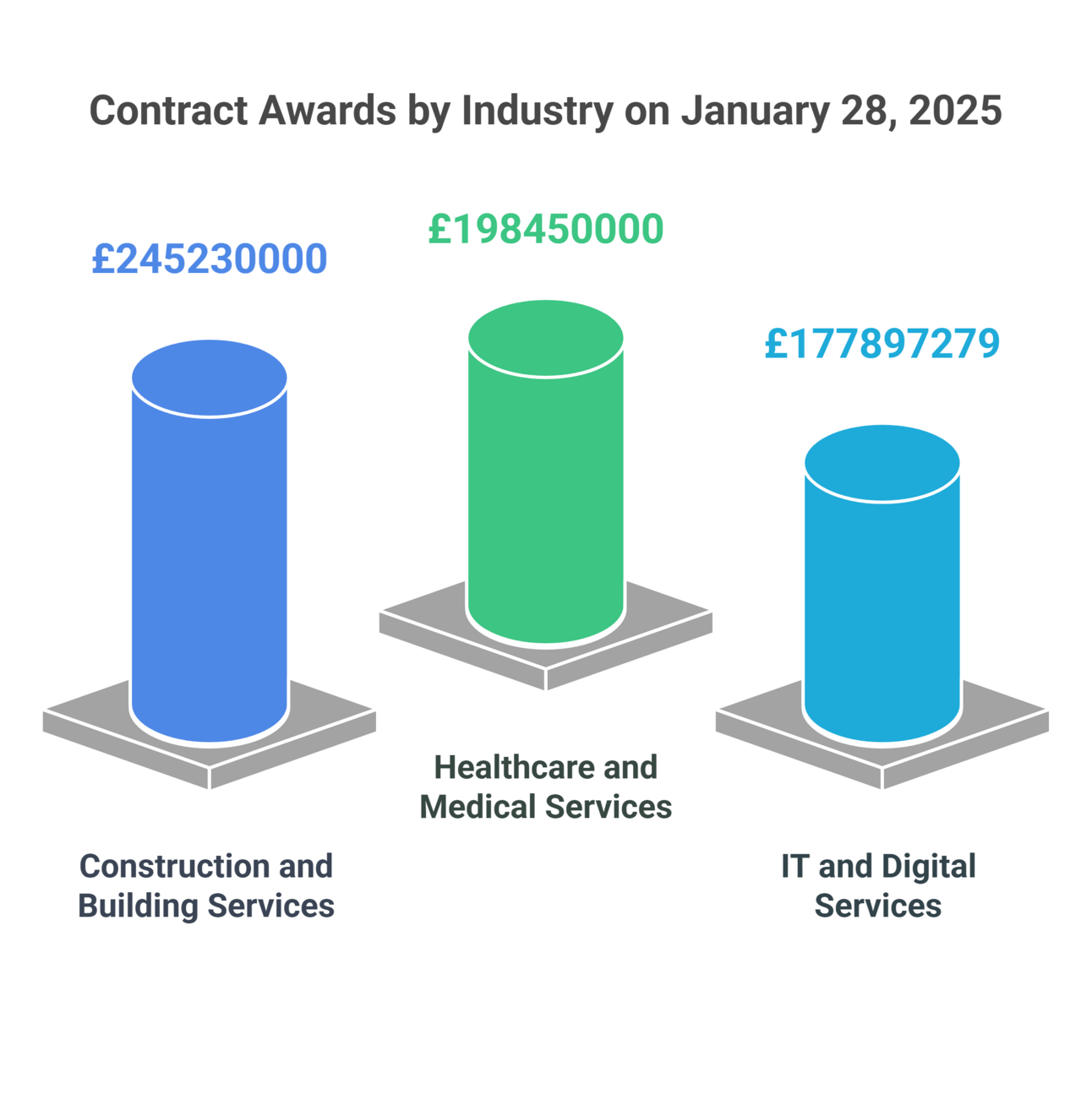 On January 28, 2025, contract awards demonstrated strong momentum in infrastructure development and healthcare modernization. The high average contract value suggests a preference for consolidated service providers. The construction sector dominated the day's awards, indicating significant public sector investment in building projects. Healthcare spending remained robust, while digital transformation continued as a priority. Notable trend towards larger, more comprehensive contracts rather than smaller specialized ones.